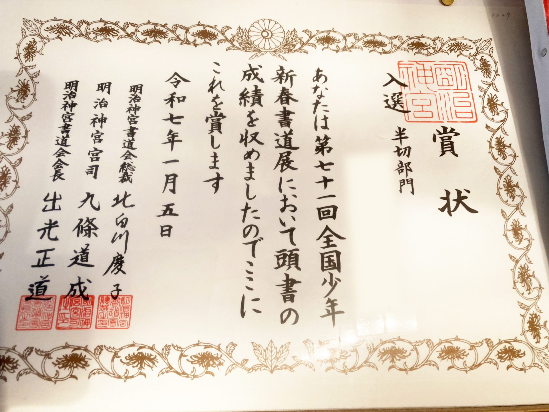 先日、毎年恒例の『明治神宮書道会、全国新春書道展』の結果が届きました!今年は小学四年生の作品が入賞をいただくことができました!